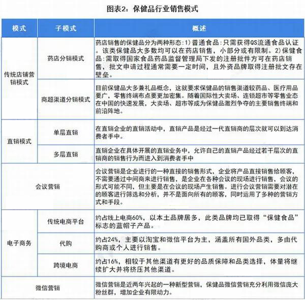 2007年以前的模式中,包括傳統店鋪銷售和直銷模式兩大主流模式,也包括會議營銷等模式,而傳統店鋪銷售模式可以分為藥店分銷模式和商超渠道分銷模式,直銷模式可以分為單層直銷和多層直銷。2007年以后,一些新興的、依托互聯網的銷售模式逐漸興起:如電子商務、微信營銷等。
